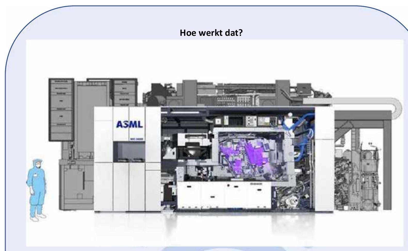 Voor het belichten van chips zijn uiterst precieze Lithografiemachines nodig. Dat zijn zeer dure en grote apparaten, die door van alle chipfabrikanten gekocht worden bij het Nederlandse bedrijf ASML. Een masker met een afmeting van zo’n 30x30cm wordt verkleind afgebeeld op de lak van de wafer. Voor het belichten wordt UV licht gebruikt. Hoe korter de golflengte van het licht, hoe kleiner de afbeeldingen gemaakt kunnen worden. De nieuwste machines die ASML maakt gebruiken EUV (Extended Ultraviolet, met een golflengte van 13,5 nm). De ‘lamp’ bestaat uit een krachtige laser die minuscule druppeltjes tin verhit die zo EUV gaan uitstralen. Daarmee kunnen lijntjes geprojecteerd worden die enkele nm uit elkaar liggen. Zo kunnen superkleine onderdelen op de chip worden gebouwd. Hoe kleiner de onderdelen, hoe sneller de chips kunnen schakelen. Elektronen hoeven minder ver te reizen, zodat energieverlies en warmteproductie minder zijn. Er kunnen méér bouwsteentjes op de chip gezet worden, zodat die meer bewerkingen kan uitvoeren en ook meer informatie kan opslaan. Volgens de wet van Moore verdubbelt elke 10 jaar de hoeveelheid transistoren op een chip. Met de nieuwste productietechnieken lukt het om die lijn vast te houden. Maar er is een grens aan: de afmeting van een atoom kun je niet kleiner maken. Kijk hier hoe een chipmachine van ASML werkt (link, url).
