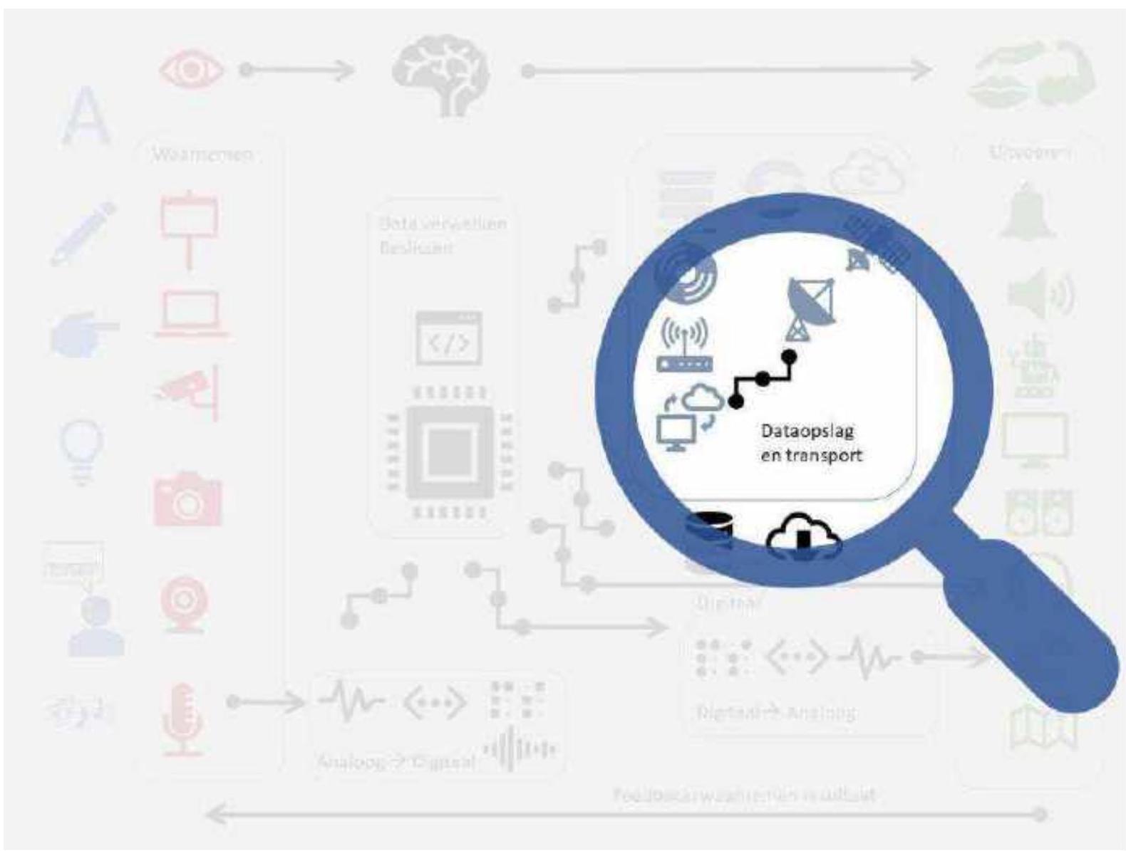 Met alleen maar een mobiele telefoon heb je eindeloos veel informatie beschikbaar. Het versturen en ophalen van data gaat snel, draadloos en onzichtbaar via de ‘cloud’. Je deelt bestanden zonder dat je er iets extra’s voor hoeft te doen. De naam ‘cloud’ suggereert dat het ergens in de lucht gebeurt, maar niets is minder waar. Overal in de wereld staan grote en kleine gebouwen zonder ramen, vol met computers en harde schijven: datacenters. Digitale data is heel geschikt om snel en zonder verlies te transporteren. Dat gebeurt met draadloze wifi en signalen en kabels van je mobiel naar datacenters en weer terug. Goede beveiliging is ook vereist. Achter dataopslag en datatransport zit een heleboel techniek die we in dit hoofdstuk beter gaan bekijken.